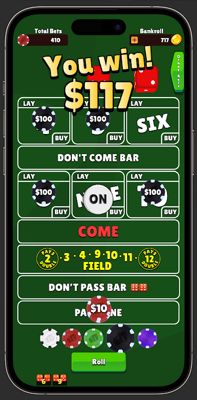 সম্পূর্ণ ক্র্যাপস বেটিং অপশন – পাস লাইন, ডোন্ট পাস, কাম, ডোন্ট কাম, অডস, ফিল্ড এবং প্লেস বেট সহ সমস্ত স্ট্যান্ডার্ড বেটের সাথে খেলুন।