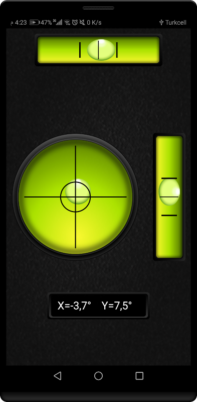 বাবল লেভেল (স্পিরিট লেভেল) অ্যান্ড্রয়েড অ্যাপ রিয়েল ওয়ার্ল্ড লেভেলের নকল করার চেষ্টা করে এবং কোনও ষাঁড়ের চোখের স্তর মিটারের মতোই ডেটা প্রদর্শন করে।