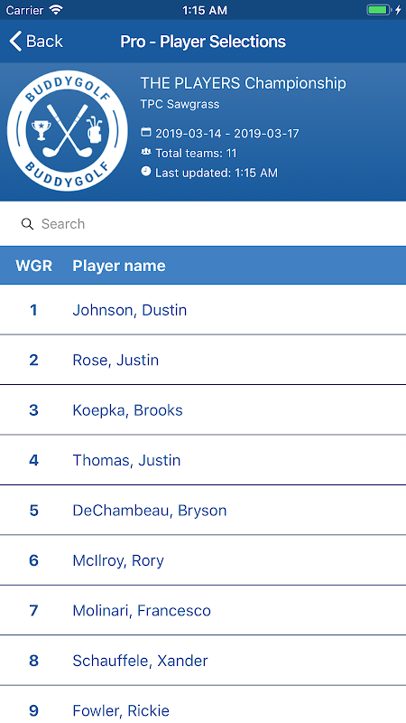 BuddyGolf একটি আসক্তি গলফ ভবিষ্যদ্বাণী অ্যাপ্লিকেশন যা আপনার PGA ভ্রমণের টুর্নামেন্টের উপভোগ বৃদ্ধি করবে।