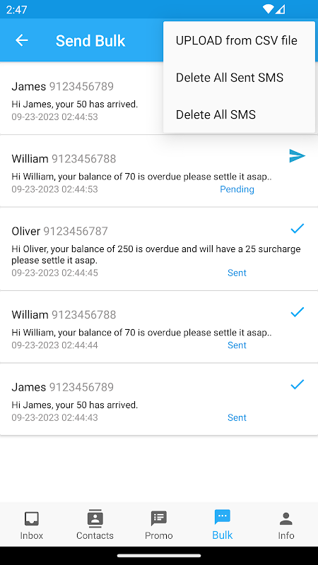 • বাল্ক মেসেজিংয়ের জন্য অনায়াসে প্রাপক/ক্লায়েন্টের বিবরণ যেমন নাম, অর্থপ্রদানের পরিমাণ, নির্ধারিত তারিখ এবং আরও অনেক কিছু কনফিগার করুন।