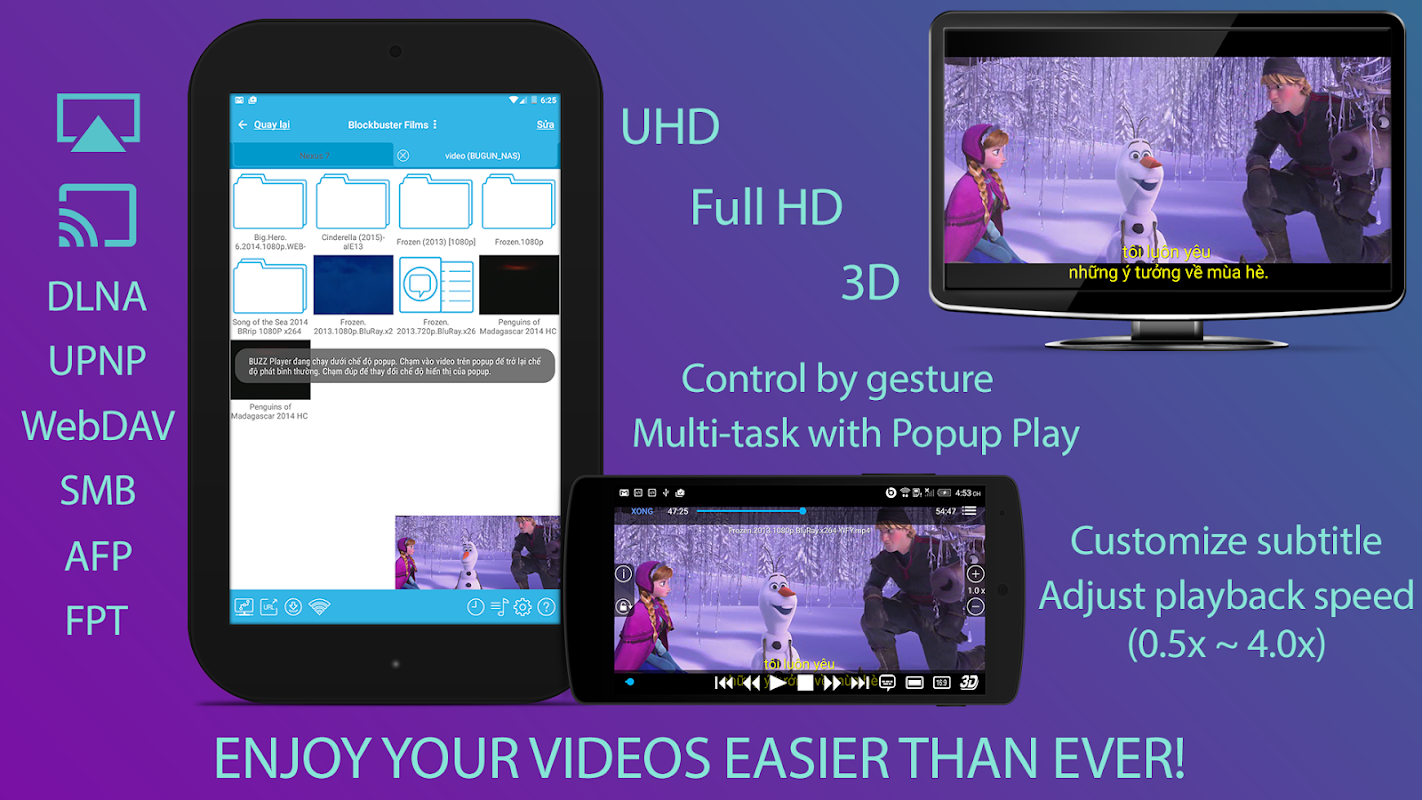 BUZZ Player is a multimedia player supporting many audio and video codecs and file formats and various streaming protocols. So, there is no worry about the file formats or restricted memory of your Phones or Tablets, user just concentrate on enjoying their favorite high quality audios, videos in a smooth way.