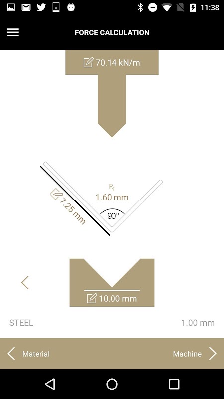 Depending on the material (e.g. steel, stainless steel or aluminium) and the material thickness the user gets an indication of the required bending force, the die opening, the box height, the stamp height, the radius and the minimal flange length. Also makes recommendations to appropriate tools and bending machines for the desired operation
