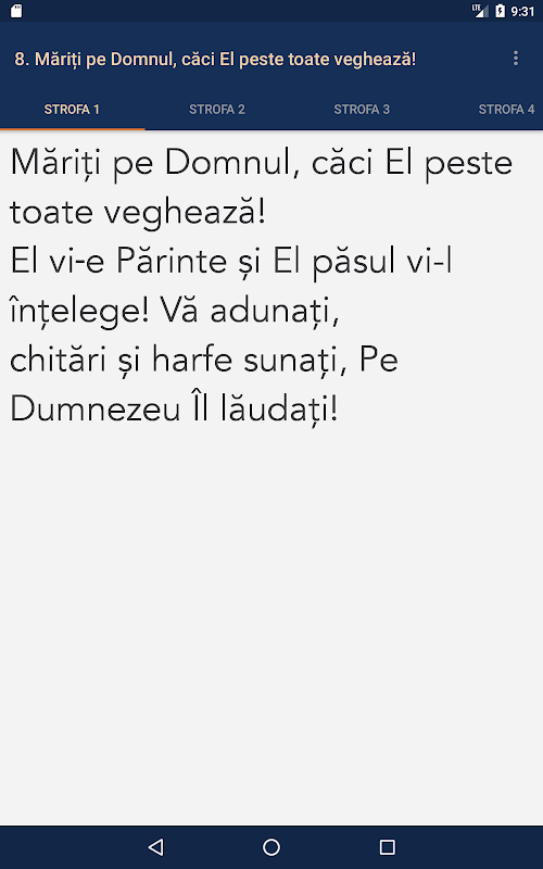 Aplicaţia conţine textul সম্পূর্ণ আল celor 1170 cântări, completat ডি tonalitate Si লয়। Cântările পাত্র ফাই ordonate সাংখ্যিক, Alfabetic Sau adăugate într-O listă পৃথক প্রিয় Ca। হে cântare Poate ফাই găsită দ্রুত căutând după număr, titlu Sau conţinut Si afişată PE শিশু ecranul Prin dublu ক্লিকে।