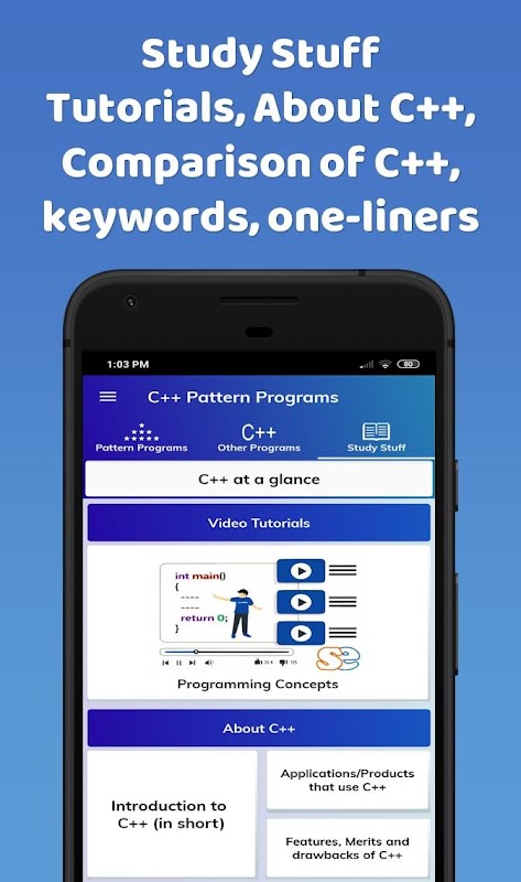 এই অ্যাপটি প্যাটার্ন এবং অন্যান্য সি ++ প্রোগ্রামে পূর্ণ of এটির পাশাপাশি, সি ++ প্রোগ্রামিং সম্পর্কিত প্রচুর স্টাডি স্টাফ রয়েছে।