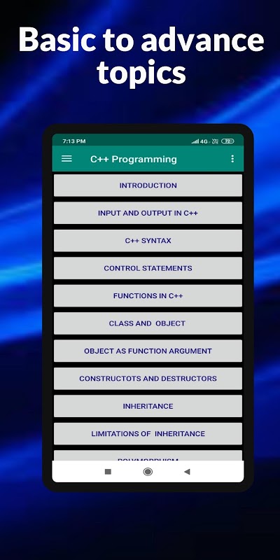 আরম্ভকারী স্তরের প্রোগ্রামাররা ওওপির ভালভাবে ব্যাখ্যা করা ধারণাটি পড়তে পারে এবং তাদের বোঝাপড়া আরও দৃ strong় করতে সি ++ প্রোগ্রাম চালাতে পারে। আমাদের সি ++ প্রোগ্রামিং অ্যাপটির একটি সহজ এবং আকর্ষণীয় অ্যাপ্লিকেশন ডিজাইন রয়েছে এবং ইউআই সত্যই আকর্ষণীয় এবং ব্যবহারকারী বান্ধব।
