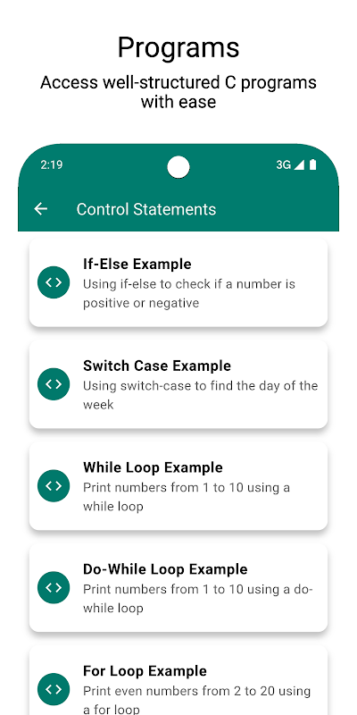 সি প্রোগ্রামস অ্যাপের মাধ্যমে সি প্রোগ্রামিং এর জগতকে আনলক করুন! আপনি একজন শিক্ষানবিস, মধ্যবর্তী, বা আপনার সি প্রোগ্রামিং সাক্ষাত্কারের জন্য প্রস্তুতি নিচ্ছেন না কেন, এই অ্যাপটিতে আপনার সি প্রোগ্রামগুলি শিখতে, কোড, অনুশীলন এবং আলোচনা করার জন্য প্রয়োজনীয় সবকিছু রয়েছে৷ টেক্সট-টু-স্পিচ (টিটিএস), সি সিনট্যাক্স হাইলাইটিং, ডার্ক মোড এবং প্রোগ্রামিং আলোচনার জন্য চ্যাটরুমের মতো উন্নত বৈশিষ্ট্য সহ, সি প্রোগ্রামিং ভাষা আয়ত্ত করার জন্য সি প্রোগ্রাম অ্যাপ হল আপনার সর্বাত্মক সঙ্গী।