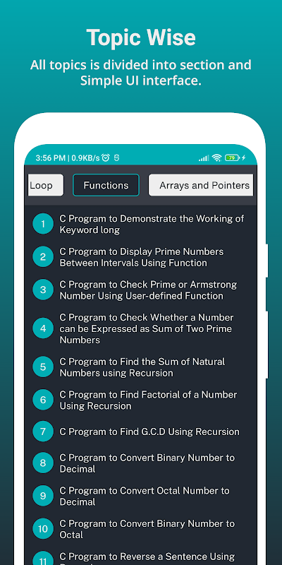 ব্যায়াম ব্যবহার করে সি প্রোগ্রামিং ভাষা শেখা দ্রুত প্রোগ্রামিং শেখার একটি সহজ উপায়। এই অ্যাপে, প্রতিটি বিষয় অনন্য আউটপুট সহ নিজস্ব উদাহরণ রয়েছে।