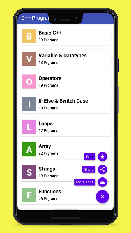 "সি ++ প্রোগ্রাম" অ্যাপ্লিকেশনটির একটি সত্যই সহজ এবং স্বজ্ঞাত ইউজার ইন্টারফেস রয়েছে। আপনাকে বিনামূল্যে সি ++ প্রোগ্রামিংয়ের ভাষা শিখতে দেওয়া সেরা আবেদন application তাহলে তুমি কিসের জন্য অপেক্ষা করছ? সি ++ প্রোগ্রামিং ভাষাতে বিশেষজ্ঞ হতে এখনই অ্যাপ্লিকেশনটি ডাউনলোড করুন