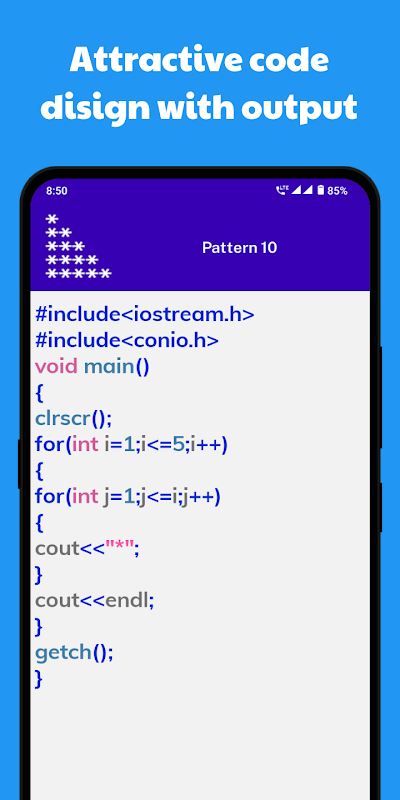 C++ Time is a free android application that contains many java programs and patterns with output.