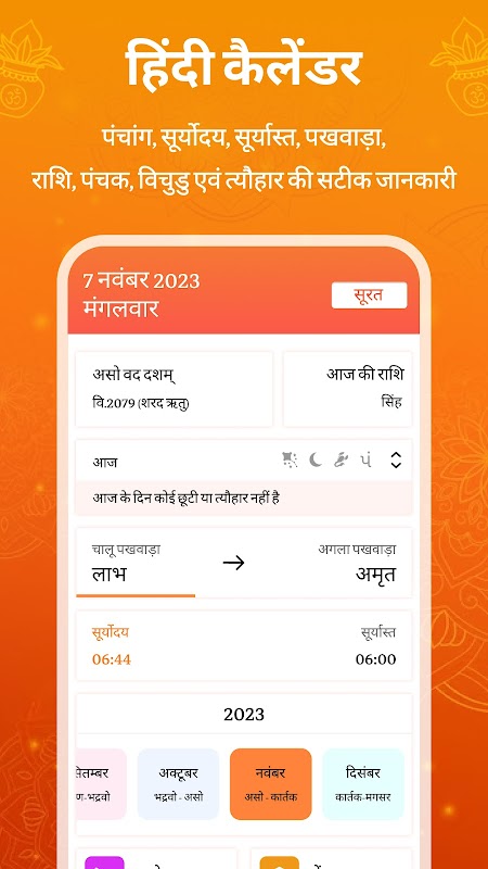একাদশী, চতুর্থী, পূর্ণিমা এবং অমাবস্যাকে হাইলাইট করে একটি মাসিক ক্যালেন্ডার দৃশ্য। উৎসবের মাসিক তালিকা দেখায়। এছাড়াও প্রতিটি তারিখের জন্য চাঁদের পর্ব দেখাচ্ছে। দিওয়ালি (দীপাবলি) সহ হিন্দু উত্সব এবং ইভেন্টগুলির তারিখ খুঁজুন,
