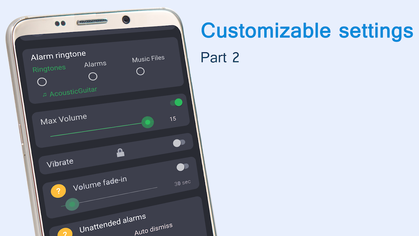 Alarm tone : Choose a persisting alarm tone from ringtones or any music file on your device.