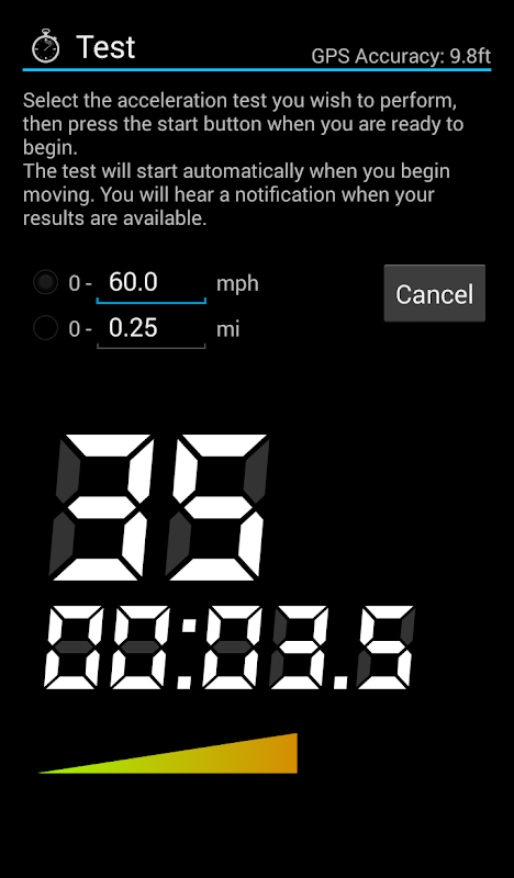 - Define your own test: record your acceleration up to your desired speed or distance.
