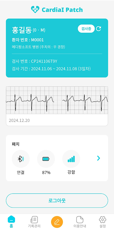 카디아이 패치 앱은 6유도 홀터 심전계인 카디아이 패치와 연동되어 검사 샜 실시간으로 모니터링하고 관리하는 어플리케이션입니다. 병원에서 의료진이 등록한 환자 정보로만 로그인할 수 있습니다.