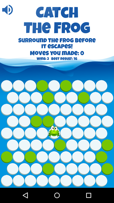 The goal of this fun free puzzle game is to prevent the green frog from jumping out of the pond. Find the best strategy to catch him and win. It's a tricky game! You and the frog take turns, when you block a square (green circle) the frog jumps to the next square (he can only jump on white dots). When you don't circle him in time and he reaches the edge you've lost.