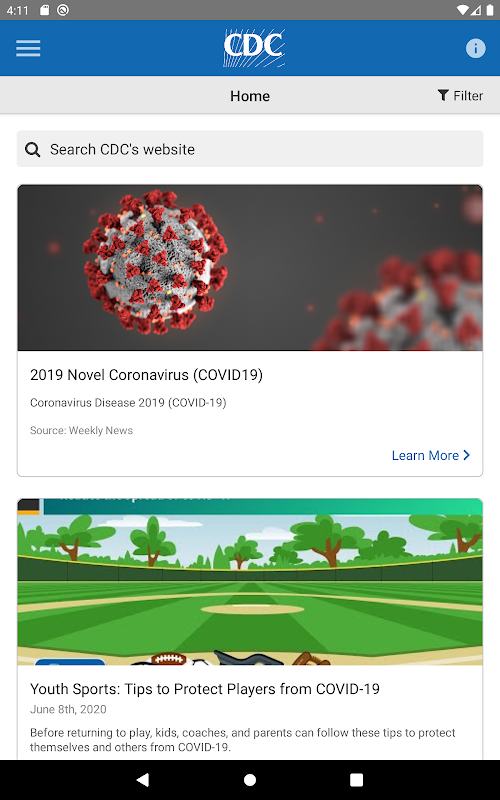 অ্যাপটি নিশ্চিত করে যে আপনি সর্বাধিক আপ টু ডেট স্বাস্থ্য তথ্য পাচ্ছেন। হোম স্ক্রীন আপনাকে আপনার সমস্ত তথ্য এক জায়গায় দেখতে দেয় এবং যখনই আপনার ডিভাইস WI-FI এর সাথে সংযুক্ত থাকে তখন আপডেট হয়৷ CDC থেকে আপনাকে সবচেয়ে সাম্প্রতিক স্বাস্থ্য তথ্য দিতে সপ্তাহের চিত্র, রোগের সংখ্যা, ভিডিও এবং পডকাস্টের মতো আরও বেশি বৈচিত্র্যের সামগ্রী উপভোগ করুন।