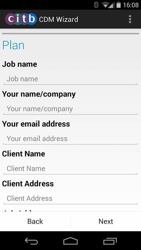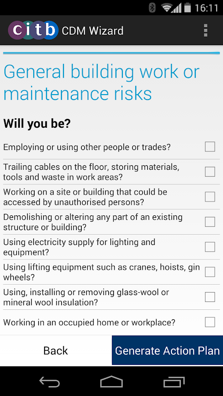 app এর সাহায্য আপনি করছেন এবং কাজের প্রকৃতি হবে সে সম্পর্কে যদি আপনার কোন প্রশ্ন অনুরোধ জানানো হবে. প্রশ্ন অধিকাংশই আপনি কম 5 মিনিটের মধ্যে পুরো প্রক্রিয়া সম্পন্ন করতে সক্ষম হবেন, সহজ টিক্টিক্ বক্স সহ উত্তর দেওয়া হয়. একটি কর্ম পরিকল্পনা তারপর আপনার ডিভাইসের সঙ্গে সঙ্গে দেখা যাবে বা দরকার কেহ ইমেল করা যাবে যে উৎপন্ন হয়. এই আপনার কাজের জন্য নির্মাণ ফেজ পরিকল্পনা এবং সিডিএম পরিকল্পনা রয়েছে 2015 অধীনে প্রয়োজন:
