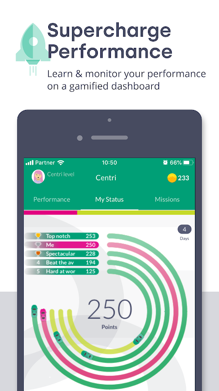 অ্যাপটি ব্যবহারকারীদের রিয়েল-টাইমে দেখায় যে তারা কী করছে এবং তাদের লক্ষ্যে আঘাত করতে তাদের পরবর্তী কী করা উচিত। তদ্ব্যতীত, এটি চ্যালেঞ্জগুলি উপস্থাপন করে এবং এটি তাদের সমকক্ষদের সাথে প্রতিযোগিতা করতে, দল জুড়ে বা স্বতন্ত্রভাবে শেখার কার্যক্রম বা লক্ষ্য-নির্দিষ্ট পারফরম্যান্সে উত্সাহিত করে।