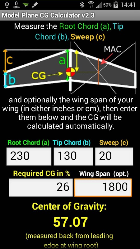 এই অ্যাপ্লিকেশানটি ভরকেন্দ্র (সি জি বা কগ বা ব্যালেন্স পয়েন্ট) আপনার পছন্দের ইউনিট গরূৎ root- এ মুখ্য প্রান্ত থেকে ফিরে মাপা এর অবস্থান গণনা করতে হবে।