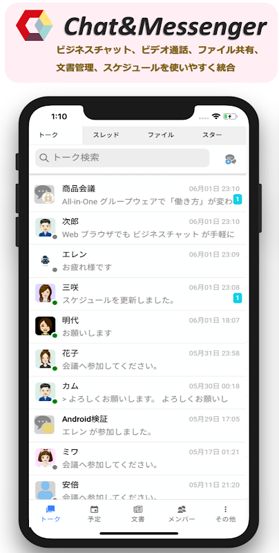 চ্যাট এবং ম্যাসেঞ্জার ব্যবসায়িক চ্যাট, ওয়েব কনফারেন্সিং, ফাইল শেয়ারিং, শিডিউল শেয়ারিং, টাস্ক ম্যানেজমেন্ট, রুম রিজার্ভেশন এবং ডকুমেন্ট পরিচালনার জন্য সহজেই ব্যবহারযোগ্য ইন্টিগ্রেটেড গ্রুপওয়্যার।