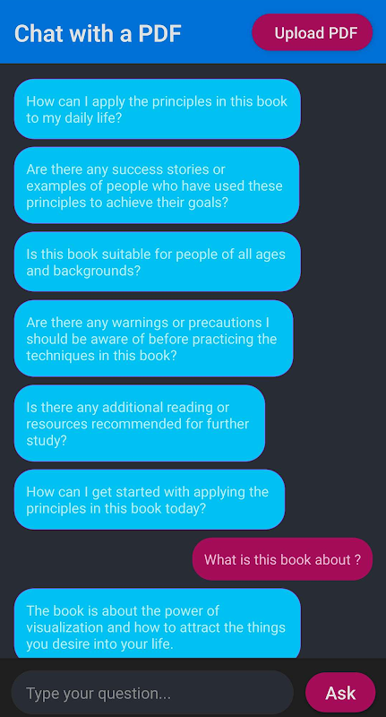 ইন্টারেক্টিভ চ্যাট ইন্টারফেস: যেকোনো PDF নথি আপলোড করুন এবং এখনই চ্যাটিং শুরু করুন। বিষয়বস্তু সম্পর্কে প্রশ্ন জিজ্ঞাসা করুন, এবং তাত্ক্ষণিক, সঠিক প্রতিক্রিয়া পান।
