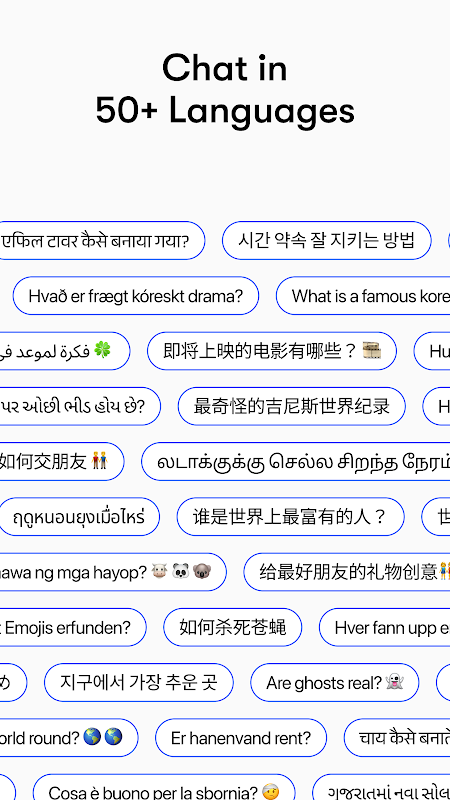- বহুভাষিক বহুমুখিতা: হিন্দি, গুজরাটি, বাংলা, মারাঠি, কোরিয়ান, জাপানি, গ্রীক এবং আরও অনেক কিছু সহ বিভিন্ন ভাষায় চ্যাট করুন।