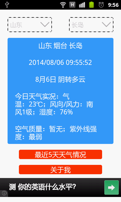 This application supports China's provinces and cities and counties weather forecast, supports a variety of phone resolution, tablet support 800X1280 Resolution