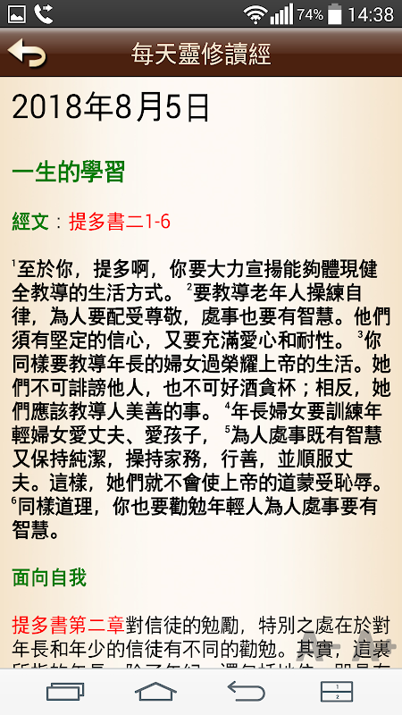 ব্রাউজিং ইতিহাসের ফাংশন: আপনি যখন অ্যাপ্লিকেশনটি ছেড়ে দিয়ে আবার এটিকে খুলবেন তখন প্রোগ্রামটি স্বয়ংক্রিয়ভাবে সেই অবস্থানটিতে চলে যাবে যেখানে শাস্ত্রের সর্বশেষ প্রদর্শিত হয়েছিল এবং আপনি ব্যবহারকারী আগে পড়া শাস্ত্রের historicalতিহাসিক রেকর্ডও নির্বাচন করতে পারেন।