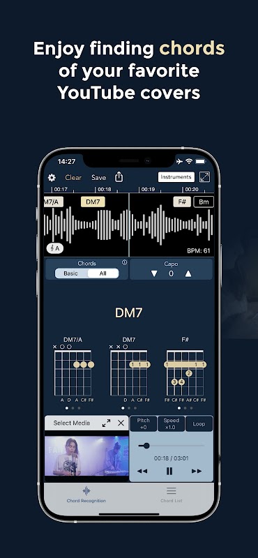 Chord ai আপনার ডিভাইস থেকে, যেকোনো ভিডিও/অডিও স্ট্রিমিং পরিষেবা থেকে বা আপনার চারপাশে লাইভ বাজানো মিউজিক শোনে এবং তাৎক্ষণিকভাবে কর্ডগুলি সনাক্ত করে। তারপরে এটি আপনাকে আপনার গিটার, পিয়ানো বা ইউকুলেলে গানটি চালানোর জন্য আঙুলের অবস্থান দেখায়।