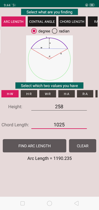 এই ক্যালকুলেটরটিতে আপনি চাপের দৈর্ঘ্য, কেন্দ্রীয় কোণ, জ্যা দৈর্ঘ্য, ব্যাসার্ধ, উচ্চতা, সেক্টর অঞ্চল, বিভাগ অংশ can
