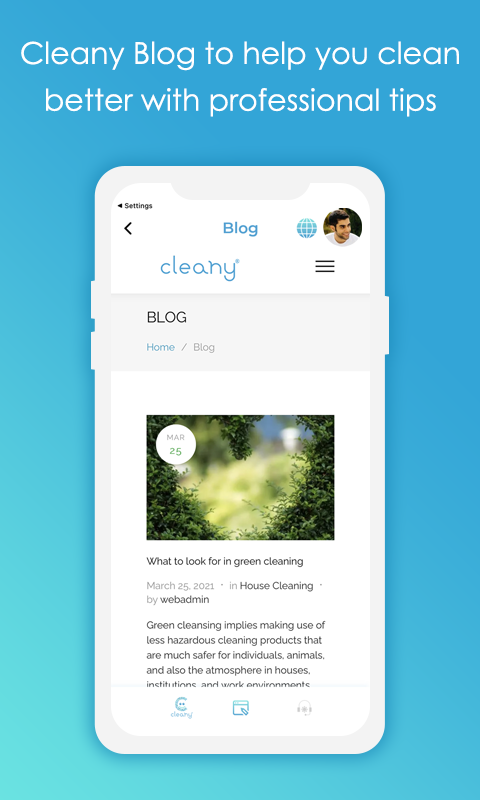 Cleany app is the simple and easy way to book top rated local cleaners for your home & office needs. Think of us as your personal cleaning concierge accessible from the comfort of your pocket. Book. Pay. Relax.