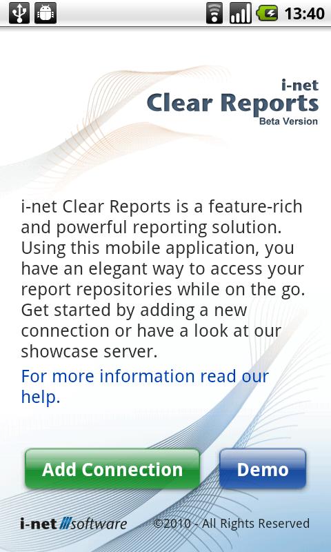 দ্রষ্টব্য: আপনি "ডেমো" বোতামটি ব্যবহার করে আপনার নিজের রিপোর্ট সার্ভার ছাড়াই অ্যাপটি পরীক্ষা করতে পারেন। এটি একটি ডেমো সার্ভার অ্যাক্সেস করবে, কিন্তু আপনার নিজের আই-নেট ক্লিয়ার রিপোর্টস সার্ভারের সাথে এই অ্যাপটির সম্পূর্ণ ব্যবহার করার জন্য, একটি আই-নেট ক্লিয়ার রিপোর্টস প্লাস লাইসেন্স প্রয়োজন। রিপোর্ট রিপোজিটরি বৈশিষ্ট্য শুধুমাত্র এই লাইসেন্সের সাথে উপলব্ধ। আমাদের ওয়েব সাইটে আপনি আই-নেট ক্লিয়ার রিপোর্টস প্লাসের একটি বিনামূল্যে ট্রায়াল সংস্করণ পেতে পারেন।