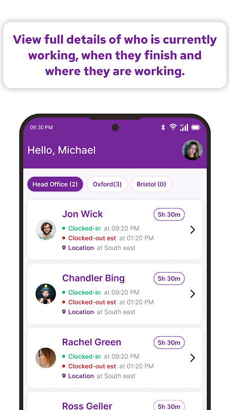 ক্লকিং আউট আপনার টিমকে তাদের শিফটে সময় রেকর্ড করার জন্য একটি অ্যাপ প্রদান করে এবং বর্তমানে কে ক্লক ইন আছে এবং কারা ক্লক আউট হয়েছে তা দেখার একটি সহজ উপায়।