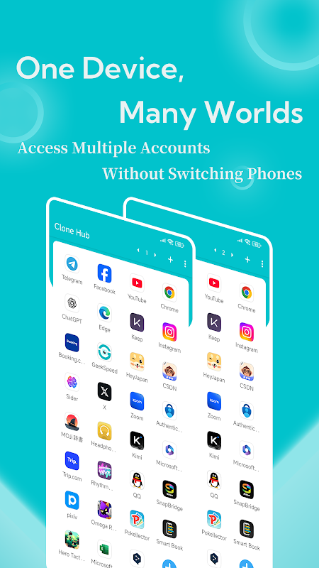 মাত্র কয়েকটি ট্যাপ দিয়ে সহজেই আপনার প্রিয় অ্যাপের নকল করুন। একই ডিভাইসে সোশ্যাল মিডিয়া, মেসেজিং বা গেমিং-এর জন্য একাধিক অ্যাকাউন্ট ব্যবহার করুন—আগে-পিছনে স্যুইচ করার দরকার নেই।