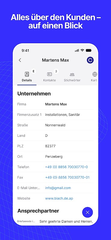 • ঠিকানা ডেটা, যোগাযোগের ইতিহাস, কীওয়ার্ড, অতিরিক্ত ডেটা, অ্যাপয়েন্টমেন্ট ক্যালেন্ডার এবং বিক্রয় প্রকল্প। কোবরা সিআরএম থেকে সমস্ত প্রাসঙ্গিক তথ্য মোবাইল ডিভাইসে উপলব্ধ