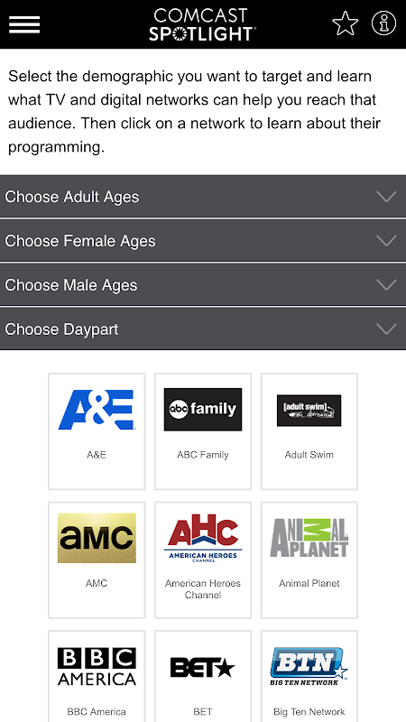 From general entertainment to music, sports and news, Comcast Spotlight has more than 50 demographically targeted networks that advertisers can use to connect with customers. We created this great tool to show you what TV & online networks will help you reach your target demographic and during what times of the day.