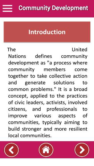 সম্প্রদায় উন্নয়ন একটি প্রক্রিয়া হিসাবে সম্প্রদায় সদস্যরা সম্মিলিত পদক্ষেপ গ্রহণ এবং সাধারণ সমস্যার সমাধান উত্পন্ন করার জন্য একত্রিত হয়। সম্প্রদায় বিকাশের এই শিক্ষামূলক অ্যাপটিতে আপনি সম্প্রদায়ের বিকাশের নিম্নলিখিত বুনিয়াদি বিষয়গুলি সম্পর্কে শিখবেন be