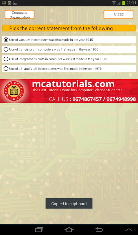 এই অ্যাপ্লিকেশন শিক্ষার্থীদের জন্য নিজেদের প্রস্তুত করতে সাহায্য করে. প্রতিটি প্রশ্ন 4 বিকল্প উপস্থিত রয়েছে. আপনি সঠিক এক চয়ন আছে. কোন সময় সীমা নেই. আপনি সঠিক উত্তর বাছাই করে হলে এটা আপনার বিকল্প যে আপনি সবুজ রঙের চয়ন এবং পরের প্রশ্নে সরাতে দেখাবে. আপনি ভুল উত্তর বাছাই করে হলে লাল আপনার পছন্দ এবং তারপর সবুজ সঠিক অপশন প্রদর্শন করা হয়. এই কমান্ডের সাহায্যে আপনি প্রশ্ন জন্য সঠিক উত্তর জানতে এবং পরীক্ষার জন্য এটি মনে রাখতে সাহায্য করে.