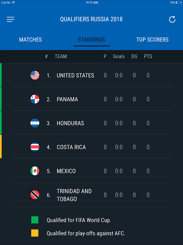 Enjoy now the full schedule of CONCACAF qualifying for the 2018 World Cup Russia and see the results live of all matches. Find out about the dates and places where the matches will be played, the standings and the results of the games, all for free.