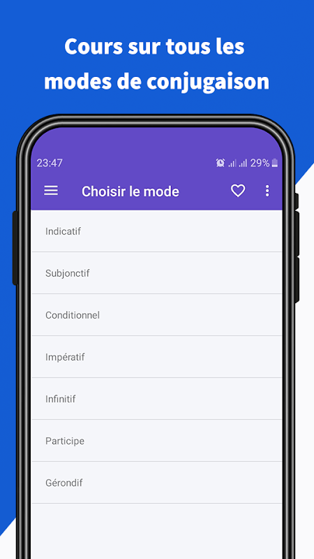- অফলাইন ফ্রেঞ্চ কনজুগেশন: কোনও খরচ ছাড়াই অ্যাপ্লিকেশনটির সুবিধা নিন এবং ইন্টারনেট সংযোগ ছাড়াই এর সমস্ত সামগ্রী অ্যাক্সেস করুন৷ সংযোজন শেখা এত সহজ এবং অ্যাক্সেসযোগ্য ছিল না!