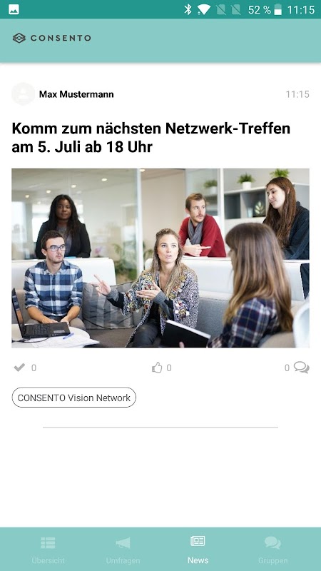সকল সদস্যদের desNetzwerks মধ্যে CONSENTO অ্যাপ অভ্যন্তরীণ যোগাযোগ এখন সহজে এবং দ্রুত কাজ করে।