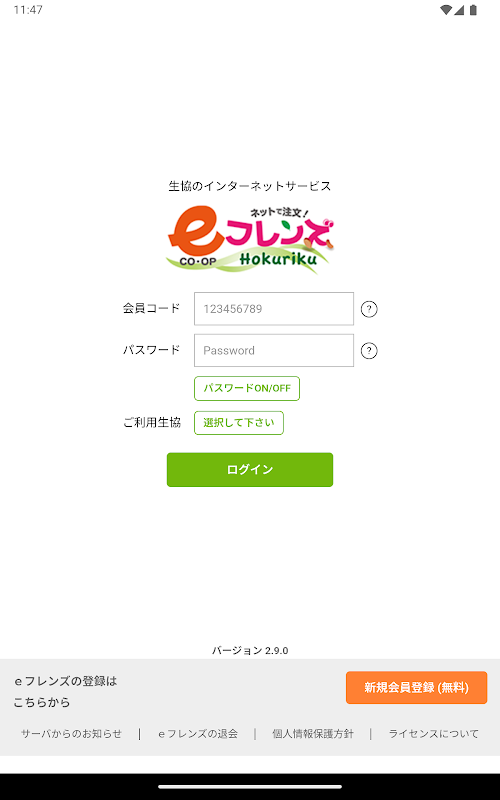 এই অ্যাপটি ব্যবহার করার জন্য, আপনাকে একটি ভোক্তা সমবায়ে যোগ দিতে হবে এবং ই-ফ্রেন্ডস সদস্য হিসেবে নিবন্ধন করতে হবে। বিস্তারিত জানার জন্য, অনুগ্রহ করে তোয়ামা কনজিউমার কো-অপ, কোপ ইশিকাওয়া, অথবা ফুকুই প্রিফেকচারাল কনজিউমার কো-অপের সাথে যোগাযোগ করুন।