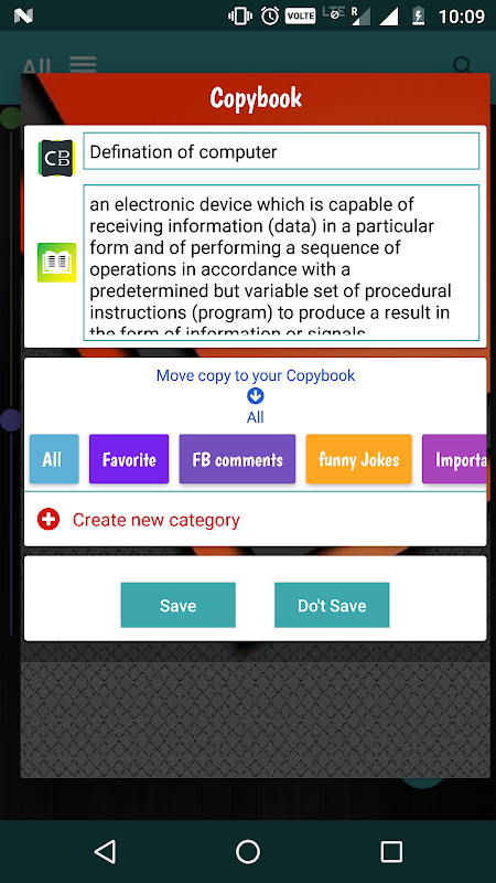 কপিবুক অন্যকে প্রিয় মন্তব্য, টুইট, ওয়েবসাইট লিঙ্ক, নোটস, জোকস ইত্যাদি সংরক্ষণে সহায়তা করে কেবল কোনও অ্যাপ্লিকেশন থেকে পাঠ্য অনুলিপি করুন এবং আপনার ব্যক্তিগতকৃত বিভাগের নাম সংরক্ষণ করুন name