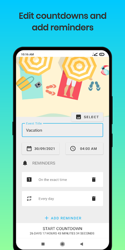 কাউন্টডাউন অ্যাপ একটি দিন কাউন্টার যা আপনাকে আপনার ইভেন্টগুলি রেকর্ড করতে, অ্যাপের মধ্যে এটি ট্র্যাক করতে বা হোম স্ক্রিনের জন্য কাউন্টডাউন উইজেট পিন করতে দেয়। আপনার ইভেন্ট, ছুটির দিন, বার্ষিকী, ক্রিসমাস এবং অন্যদের গণনা করার জন্য এটি একটি খুব সহজ অ্যাপ্লিকেশন। আপনি কেবল একটি পটভূমি নির্বাচন করুন, একটি শিরোনাম এবং সময় লিখুন। তারপর, কাউন্টডাউন অ্যাপ আপনার জন্য দিন গণনা শুরু করবে। এছাড়াও, আপনি আপনার হোমস্ক্রিনের জন্য একটি কাউন্টডাউন উইজেট যোগ করতে পারেন ইভেন্টটি ট্র্যাক করার জন্য এমনকি যদি আপনি অ্যাপটি না খুলেন।