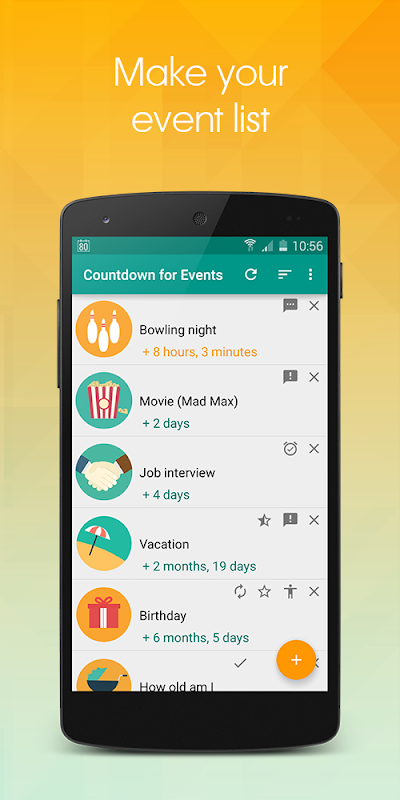 Count time just in days or in years, months and days, on event day – in hours and minutes. When event time comes, Countdown for Events will remind you about it - you will receive notification, alarm will ring or you can receive SMS.