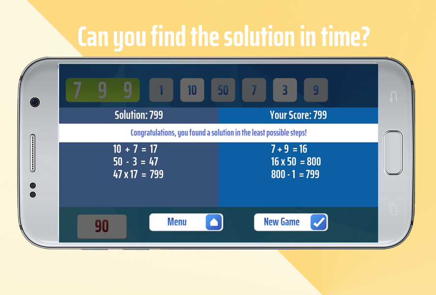 আপনার হাতে থাকা ছয়টি নম্বর ব্যবহার করে আপনাকে অবশ্যই এলোমেলোভাবে তৈরি করা লক্ষ্য নম্বরটি খুঁজে বের করতে হবে, তবে আপনি প্রতিটিতে একবার ব্যবহার করতে পারবেন! চারটি মৌলিক বীজগণিত অপারেশন আপনার জন্য উপলব্ধ: যোগ, বিয়োগ, গুণ এবং ভাগ। নোট করুন যে আপনি অনুষ্ঠানের নিয়ম অনুযায়ী ঋণাত্মক সংখ্যা বা ভগ্নাংশ ব্যবহার করতে পারবেন না।