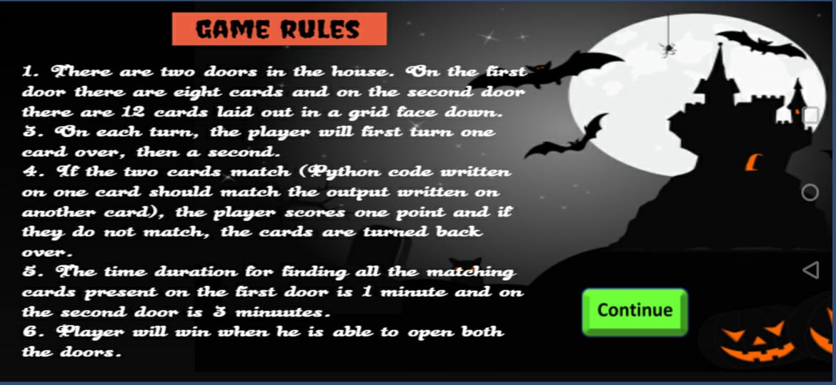 ৩. একটি রহস্যের ঘরে দুটি দরজা রয়েছে। খেলোয়াড়কে স্বর্ণ পেতে দুটি দরজা খুলতে হবে। দরজা খোলার জন্য তাকে পাইথন কোডটি ক্র্যাক করতে হবে। প্রথম দরজাটিতে আটটি কার্ড এবং দ্বিতীয় দরজার উপরে একটি গ্রিডে মুখ নিচু করে রাখা 12 টি কার্ড রয়েছে।