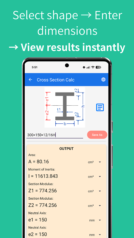 মাত্রা প্রবেশ করিয়ে, আপনি তাৎক্ষণিকভাবে বিভাগের ক্ষেত্রফল, ক্ষেত্রের দ্বিতীয় মুহূর্ত (জড়তার মুহূর্ত), বিভাগের মডুলাস এবং নিরপেক্ষ অক্ষের অবস্থান গণনা করতে পারেন।