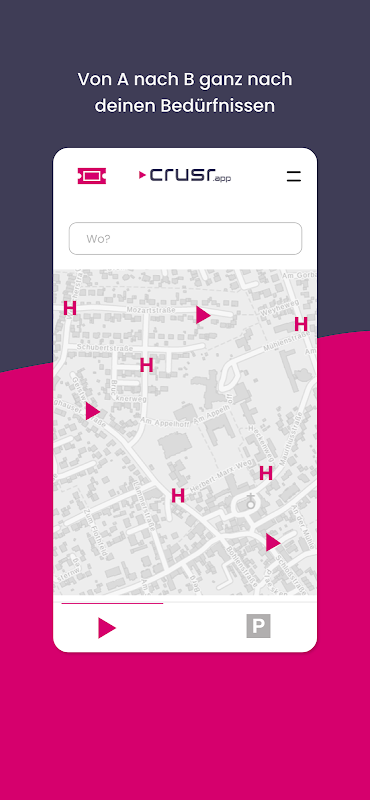 Die crusr®-App befindet sich in der BETA-Phase. Sie und die zugehörigen Mobilitätsangebote sind ein Pilotprojekt zur vernetzten Mobilität und werden gemeinsam mit dir und den jeweiligen Anbietern jeden Tag weiterentwickelt. Gib uns also jederzeit Feedback - entweder direkt über die App oder per Mail.