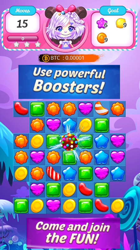 Switch and match Candies in this tricky puzzle adventure to progress to the next level for that sweet winning feeling! Solve crypto puzzles with quick thinking and smart moves, and be rewarded with bitcoins rainbow-colored cascades and colored candy combos!