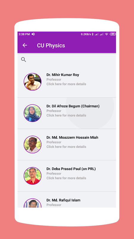 ⇨ Teachers - You will find this feature in the home menu. With this feature users can access to the important information of the teachers of the Department of Physics, Chittagong University (CU) like teacher's about, contact numbers, email address and Research Gate profile.